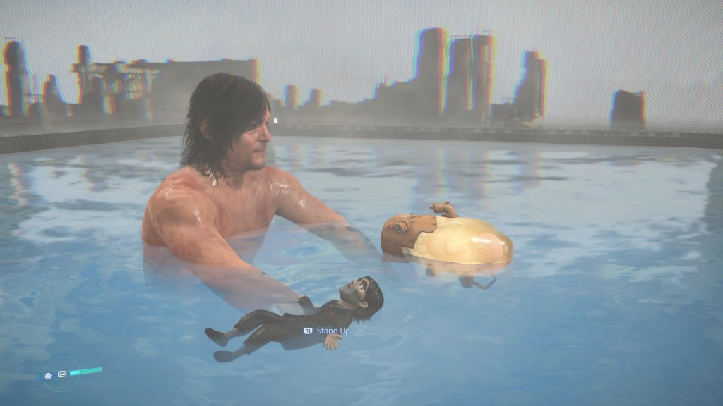 Unlike the first game, which saw Sam mostly on his own, only encountering the supporting cast in their own outposts, there’s a crew along for the ride. You don’t see them outside of cutscenes, but you do return to the Magellan constantly to rest and debrief with the cast. At first, Death Stranding 2 appeared to be repeating some of the narrative mistakes of its predecessor by hitting you with some bafflingly strange characters with the most bizarre traits—a doll that houses a man’s soul and animates at a lower frame rate, a captain whose severed hand floats in the tar and acts as a navigation beacon for the Magellan, an infinitely pregnant woman who seemingly conjures rain that reverses the effects of Timefall… you know, the rain in Death Stranding that rapidly ages anything it touches. You meet these characters and then their respective cutscenes just end, with nary a hint of confusion or wonderment on Sam’s face, as if we’re all just meant to accept that these are completely normal people to exist. And the thing is, once you’re fully in on Death Stranding, this cast becomes a curious delight and one of the highlights of the game. It’s a refreshing change for Sam to have a team with him.
